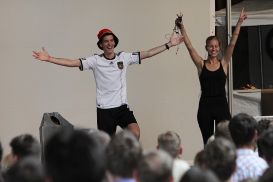 Die Moderatoren Lisa und Pascal sorgten mit einer gut eingespielten Moderation bereits zu Beginn für eine gute Stimmung und machten danach mit allen Anwesenden eine lustige Aufwärmübung.