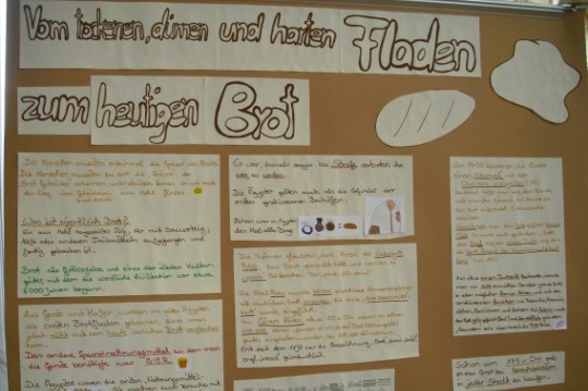 So sah man zu dem Wort vom „Brot des Lebens“ mehrere Pinnwände mit verschiedenen Aspekten dieses Themas. Auf der einen wurden Brotsorten vorgestellt, eine andere enthielt Gedichte, Sprüche und Bilder, die sich ernsthaft aber auch humorvoll mit der Bedeutung des Brotes für die Menschheit auseinandersetzten. |